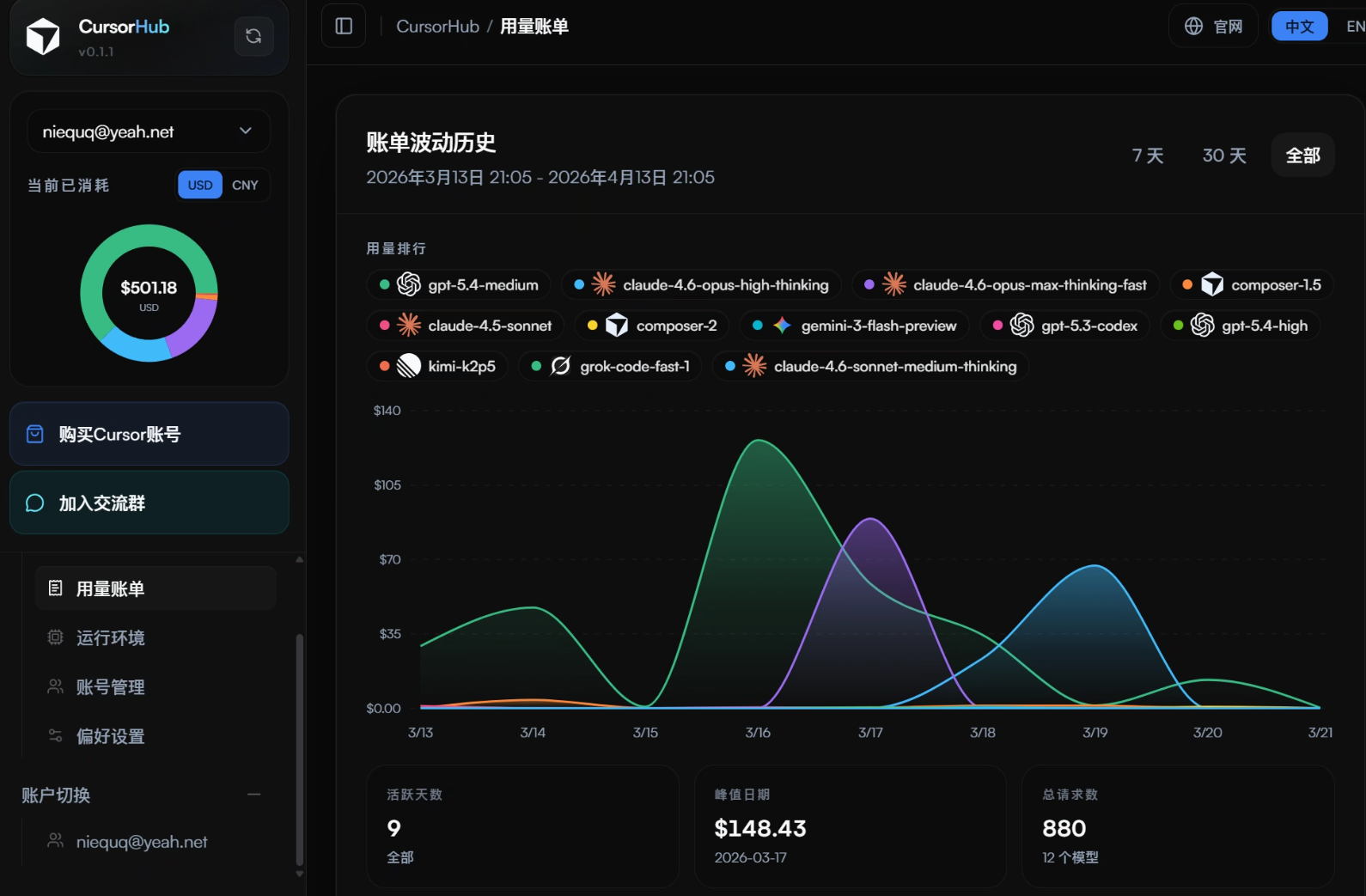 Cursor Usage 是一个面向 Cursor 使用场景的桌面管理工具,主要用于帮助用户更方便地查看和管理本机 Cursor 相关的账号信息、用量数据、账单消耗、设备环境以及本地配置。