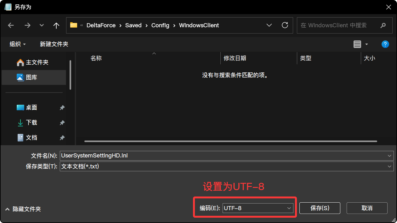 D:\WeGameApps\rail_apps\DeltaForce(2001918)\DeltaForce\Saved\Config\WindowsClient 找到UserSystemSettingHD.ini文件